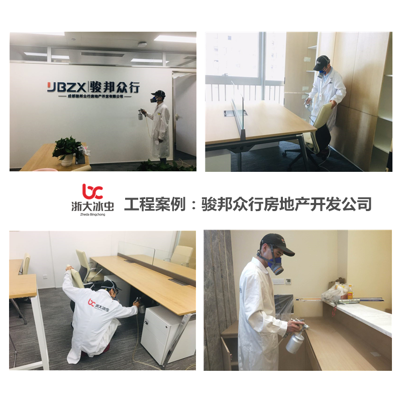 浙大冰虫为骏邦众行房地产开发公司进行室内空气治理,为保障更好的达到治理效果,治理中对应不同的环境,材质物品进行不同的药水进行施工,感谢客户对我们的信任。